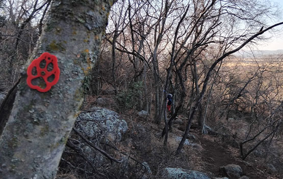 Voets Toets Hiking completed both trails. We started with the more technical, advanced Rooi-ivoor route. This route is quite technical, and involves both elevation gain and navigation through the rocky trail. The route takes you up the koppie where you get beautiful views from the top. It's a shaded hike with many trees and the bird life was amazing!
