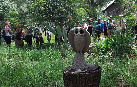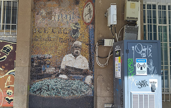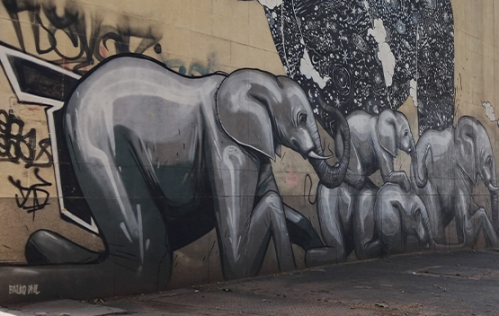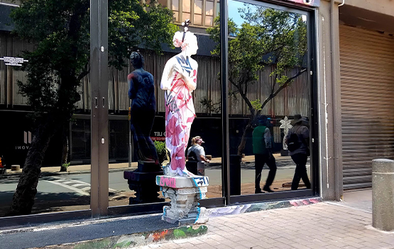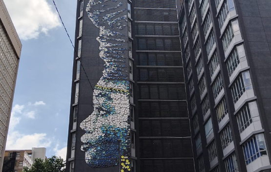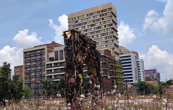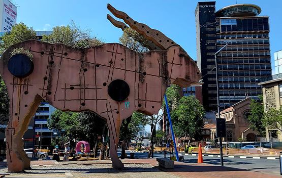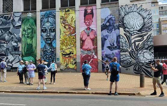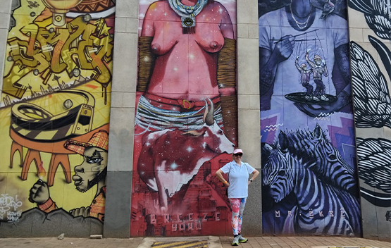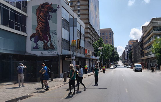 Our guide, Peter Geach, took us on a magical urban journey. Our first stop was at the 'Eland', an art piece created by Clive van den Berg. We then passed the Holy Trinity Church before stopping to admire some of Hannelie Coetzee's mosaic artwork. We proceeded on, mesmerised by Malik's street graffiti depicting a 'Giggling Hyena', and Falko's 'Elephants'. We followed Juta Street, where we saw a steel forest of 26 metal trees.