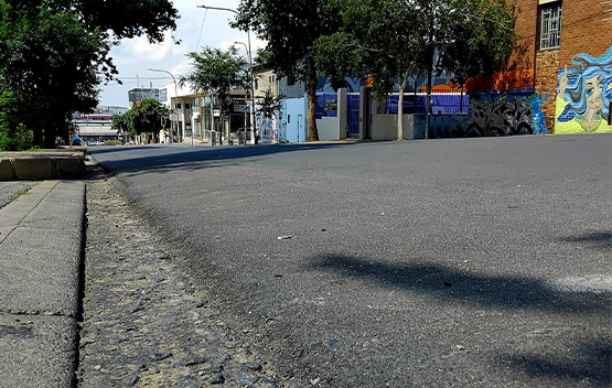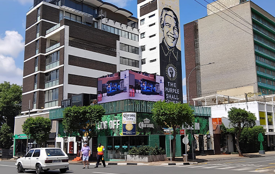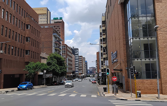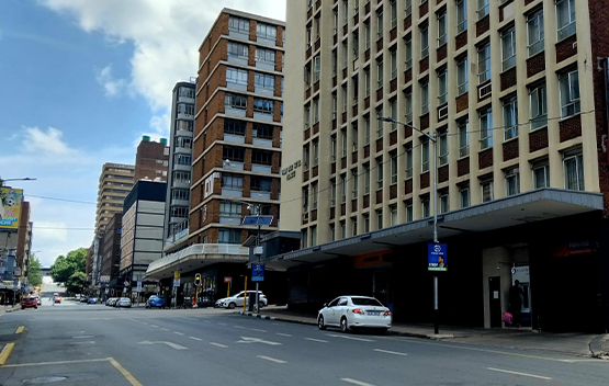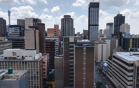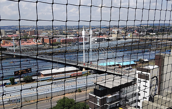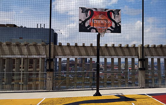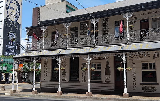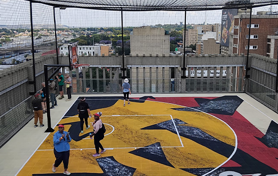 After some exploring, we headed to Milner Park Hotel, built in 1888, which still houses Kitcheners, Johannesburg's second oldest bar. Next, we climbed thirteen flights of stairs to reach the rooftop basketball court, where we were rewarded with stunning views of the Johannesburg skyline, Nelson Mandela Bridge, and the old train station.