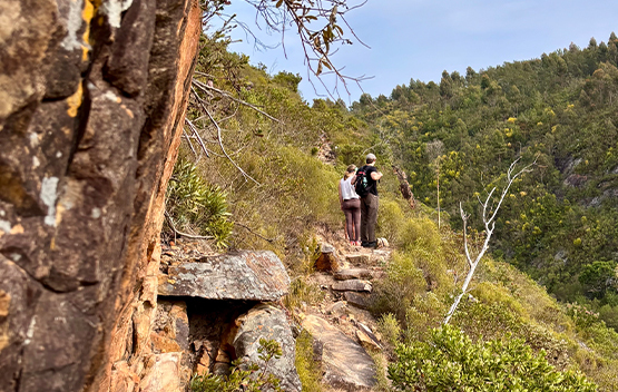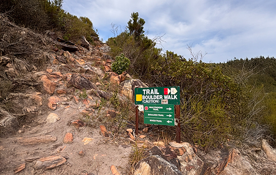 This trail is quite rocky and uneven, so we recommend a hiking stick and Merrell shoes with good grip. Take enough water with you as there is none on trail. We hike far above the Van Stadens river, we don’t go down to it.